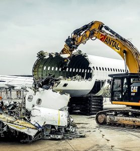 „In knapp einem Tag hatte der Bagger die Arbeiten erledigt – deutlich schneller als wir eigentlich geplant hatten“, meint Antal-Projektleiter Daniel Deigert. Auch wenn es für Bagger und Maschinist keine Routineaufgabe war, so war es für die Abbruchfirma kein Neuland. Der A319 war nicht das erste Flugzeug, das rückgebaut werden musste. Schon in der Vergangenheit hatte Antal mit einem Airbus zu tun, als ein A340 auseinandergenommen werden musste. Mit dem Zerschneiden des großen Vogels konnte der Cat 352F beginnen, nachdem das Flugzeug entkernt worden war. Das hieß: Die einzelnen Komponenten und Bauteile sortiert nach Materialien auszubauen und nach Legierungen entsprechend zu separieren sowie Verbundstoffe wie Aluminium, Titan, Kupfer, Kunststoff, Elektroschrott und Sonstiges für den Sekundärkreislauf vorzubereiten.