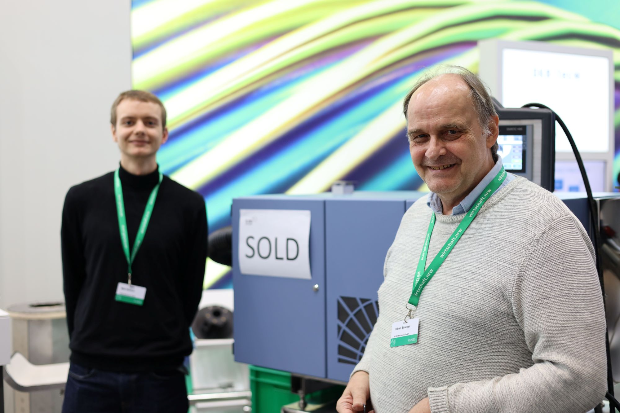Bildunterschrift: Bereits am ersten Messetag wurde das Messeexponat verkauft. Mati (l.) und Urban Stricker waren zufrieden mit dem Verlauf der K-Messe. Foto: B.IRD