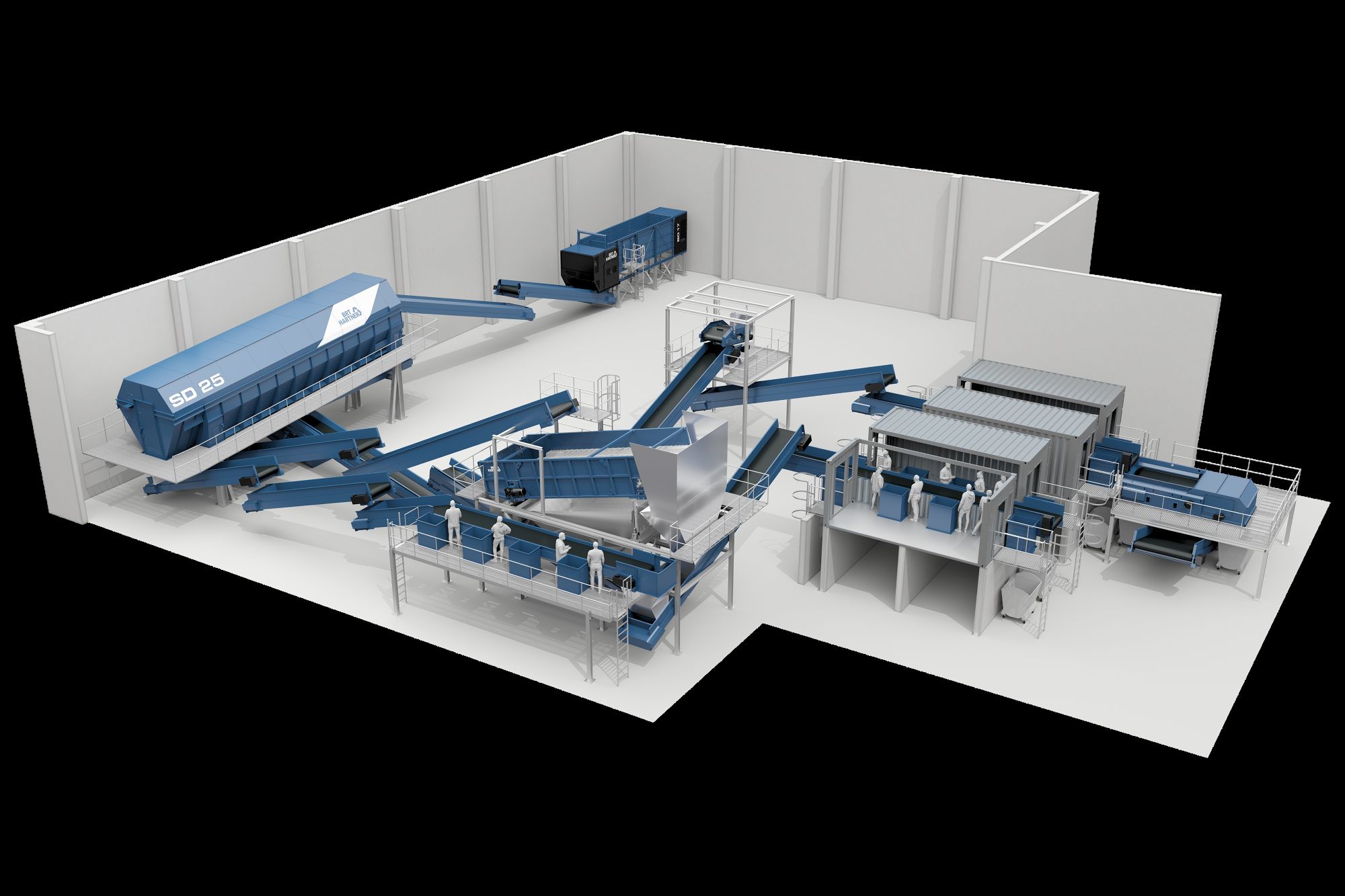 Bild oben: Unter den Systemlösungen von BRT HARTNER finden sich auch vollständige Anlagenkonzepte, welche nur noch an die Gegebenheiten vor Ort angepasst werden müssen (Visualisierung einer Sortieranlage). Abbildung: BRT Hartner
