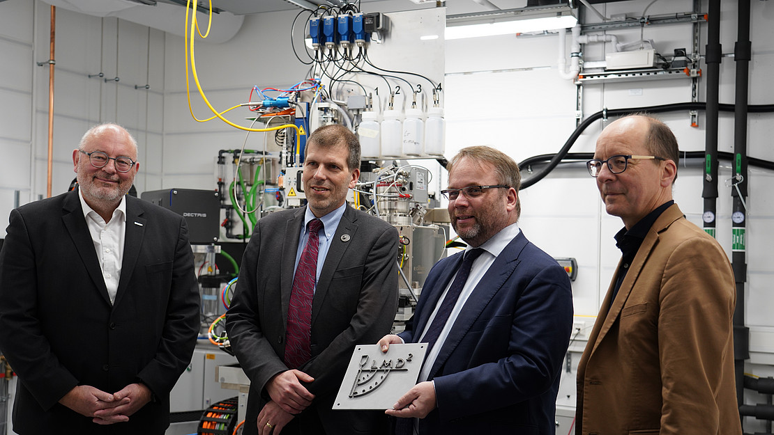 Bild oben: v. l.: Prof. Dr.-Ing. Prof. h.c. Stefan Böhm, Prof. Dr.-Ing. Thomas Niendorf, Wissenschaftsminister Timon Gremmels und Dr. Oliver Fromm bei der offiziellen Inbetriebnahme des Laserauftragsschweißgeräts. Foto: Uni Kassel