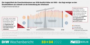 Die monatlichen Bruttoerwerbseinkommen der Beschäftigten in Deutschland waren im Jahr 2018 deutlich ungleicher verteilt als 1993. Wie eine Studie des Deutschen Instituts für Wirtschaftsforschung (DIW Berlin) zeigt, geht der Anstieg allerdings nicht in erster Linie auf ungleichere Stundenlöhne zurück, sondern auf die Entwicklung der Arbeitszeit und besonders darauf, wie diese mit den Stundenlöhnen zusammenhängt. Demnach arbeiten Beschäftigte mit hohen Stundenlöhnen im Vergleich zu Beschäftigten mit geringen Stundenlöhnen heute mehr Stunden pro Woche als früher. In vielen Fällen deckt sich die gewünschte Arbeitszeit nicht mit der tatsächlichen, zum Beispiel bei Müttern, die im Durchschnitt deutlich weniger Stunden erwerbstätig sind als sie eigentlich möchten. Gutverdienende wiederum arbeiten tendenziell mehr Stunden als gewollt. Hätten alle Beschäftigten genau so viel oder wenig arbeiten können wie gewünscht, wäre die Ungleichheit der Erwerbseinkommen in den vergangenen 25 Jahren nur halb so stark gestiegen.