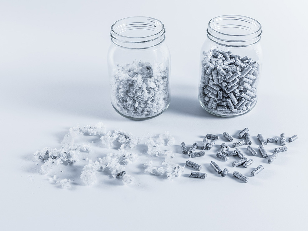Bild oben: Vorher: Geschredderte Textilfasern; nachher: Rieselfähige Pellets Abbildung: NMB