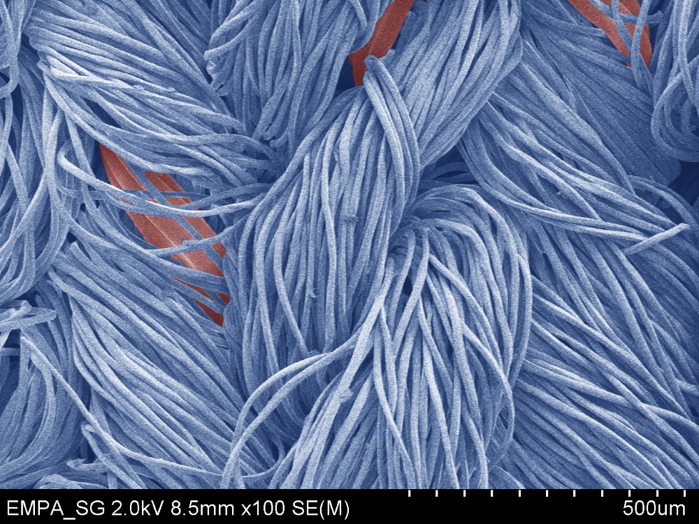 Textilfasern (blau) können mittels Plasmabeschichtung gleichmässig wasserabweisend ausgerüstet werden. Auch anspruchsvollere elastische Fasern (rot) bleiben dank des neuen Verfahrens dauerhaft imprägniert. (Rasterelektronenmikroskopie, koloriert) Bild: EmpaIn ersten Laboranalysen schneiden Textilien aus den neuen Fasern mit umweltfreundlicher Beschichtung bereits leicht besser ab als herkömmliche PFAS-beschichtete Stoffe: Sie saugen weniger Wasser auf und trocknen schneller. So richtig ins Gewicht fallen die wundersamen Eigenschaften der Fluor-freien Beschichtung aber erst nach mehrmaligem Waschen der Textilien: Während die herkömmliche PFAS-Imprägnierung bei dehnbaren Textilien bereits deutlich leidet, bleibt die Fluor-freie Faser auf hohem Niveau. Damit ist sie trotz Beanspruchung doppelt so wasserabweisend und trocknet deutlich effizienter.