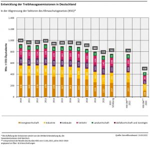 Seit 1990 sanken die Emissionen in Deutschland um 38,7 Prozent. Das Ziel für 2030 ist ein Minus von 65 Prozent. Emissionssteigerungen gegenüber dem Vorjahr gab es 2021 in nahezu allen Bereichen. Die verfügbaren Daten zeigen, dass seit 2010 vor allem die Energiewende zur Reduktion der Emissionen beigetragen hat. Alle anderen bedeutenden Sektoren stagnieren seit 2010 mehr oder weniger.